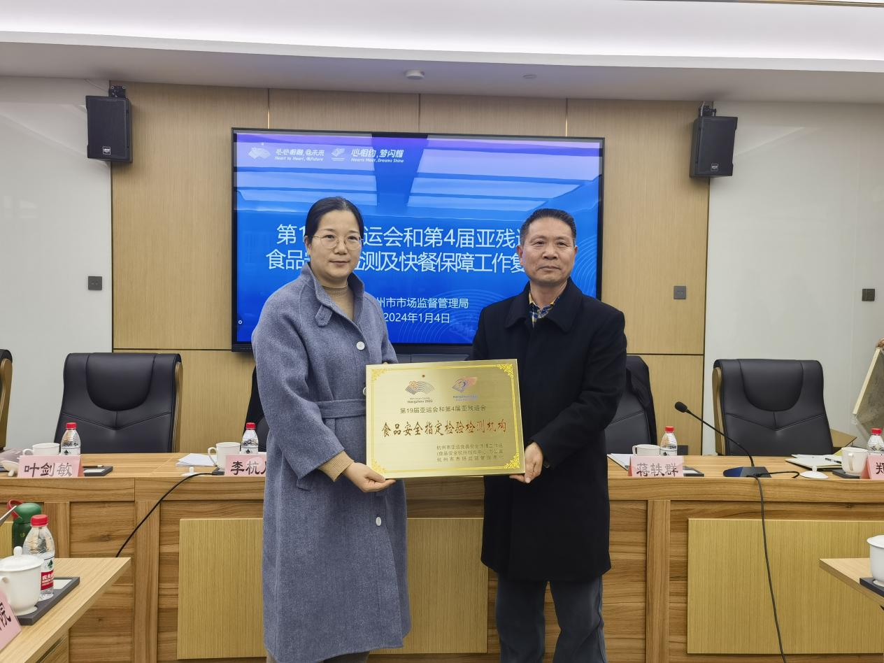 1月4日,亚(残)运会食品安全检测及快餐保障工作复盘会在千岛湖召开。会上,杭州市市场监管局餐饮处总结亚(残)运会集体用餐配送及食品安全检验检测工作开展情况,充分肯定省检科院在赛事期间专业的检测技能和高度的责任感,对检科院所做贡献表示感谢,并授予“第19届亚运会和第4届亚残运会食品安全指定检验检测机构”牌匾。食品所将以此复盘会为契机,继续为国家重大活动保障工作贡献坚实的技术力量,进一步推动检测工作再上新的台阶,再创新的辉煌!