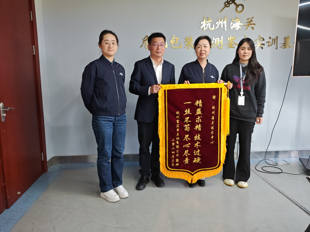 3月22日,杭州富芯半导体有限公司为感谢环化所危化与包装检测部多年来为其进口光刻胶(危化品)通关助力、帮助企业快速研发投产,向环化所赠送锦旗以表示感谢。