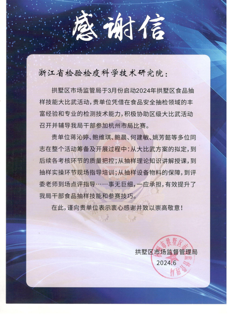 食品安全抽检工作成绩突出!省检科院获拱墅区市场监管局表扬