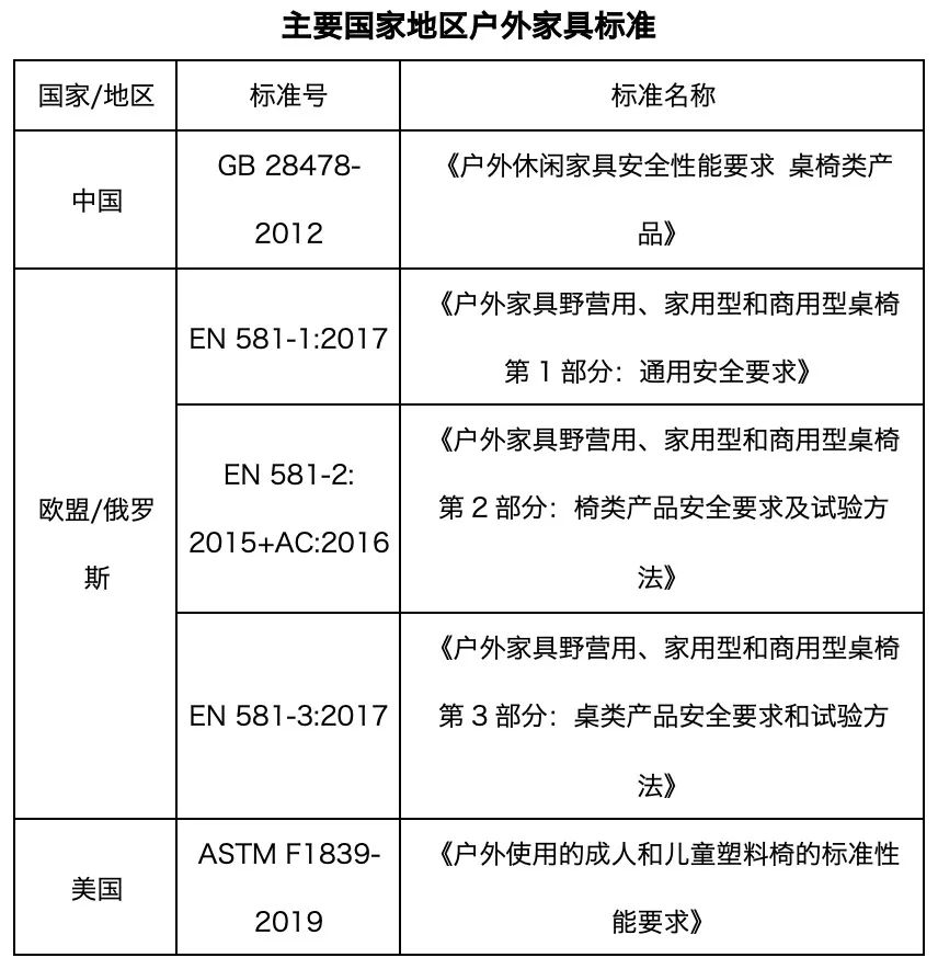 相较于商用、家用的户外休闲家具,野营用户外家具受众更广,品类繁多,质量也参差不齐,有些还有潜在的安全隐患。若想户外家具经久耐用,就要先确认产品是否通过相应的标准检测。