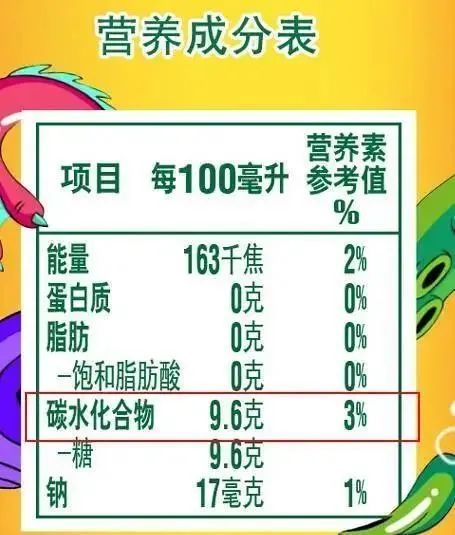 一些正规饮料的包装上都有“营养成分表”,有些已经在碳水化合物项目下,单独标出了糖的含量(如下图)