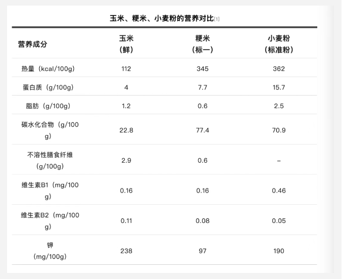 矿物质钾:玉米的钾含量为238mg/100g,虽然比不上荞麦、燕麦、高粱米、藜麦、小米等全谷物,但也比精米白面优秀,分别是粳米和小麦粉的2.5倍、1.3倍。