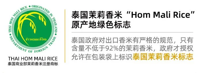 一看原产地注册商标。看有没有泰国茉莉香米Thai Hom Mail Rice绿色圆形的原产地标志,这是泰国商业部外贸厅注册的泰国香米质量标准认证标志。