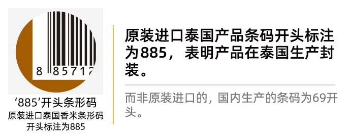 二看条码。外包装上有13位数条形码,每个国家都有特定的数字。原装进口泰国香米的包装条形码是以885开头,中国国内分装是以69开头。近期69开头的也可能是泰国原装进口。