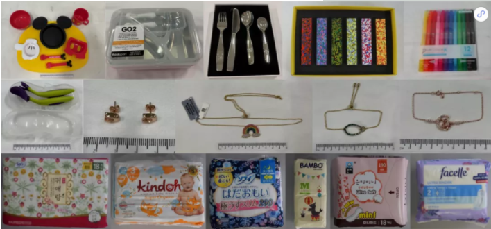 本次检测跨境进口日用轻工品24批,涉及57个检测项目。其中,仿真饰品7批、一次性使用卫生用品7批、学习用品4批、与食品接触材料6批。