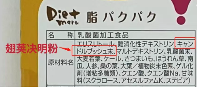 本次抽检酵素中番泻苷A和番泻苷B含量最高的为同一款产品:日本进口的Dietmaru益生菌吃油丸酵素果冻。日文配料标示含有 “翅荚决明粉” 。