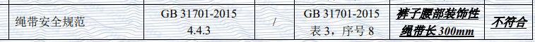 举个例子,某男童裤腰部功能性绳带平摊至最大尺寸时长120mm,符合标准要求;某女童裤子腰部装饰性绳带长 300mm,不符合标准要求。根据GB 31701-2015《婴幼儿及儿童纺织产品安全技术规范》,服装平摊至最大尺寸时,伸出的绳带长度不应超过 140 mm。具体如下图所示: