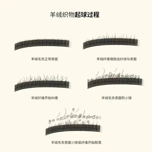 因为羊绒衫的绒面其实就是松散的羊绒纤维,而天然羊绒纤维本身覆盖鳞片,弹性好、强度高的羊绒经过摩擦形成了相互缠绕,产生起球现象,且为了突出蓬松柔软的特性,羊绒纱线一般捻度较小、条干较为丰满,容易起球。