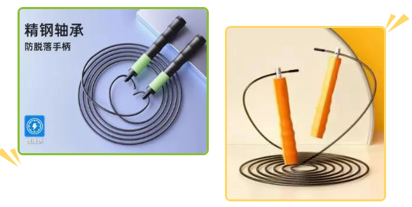 选择轴承结构手柄,确保高速旋转流畅。绳体材质轻量化(如钢丝包胶),减少空气阻力,提升转速和稳定性。钢丝绳为竞技首选,推荐2.5mm直径包胶款,搭配轴承手柄和缓冲套,避免裸露钢丝划伤。